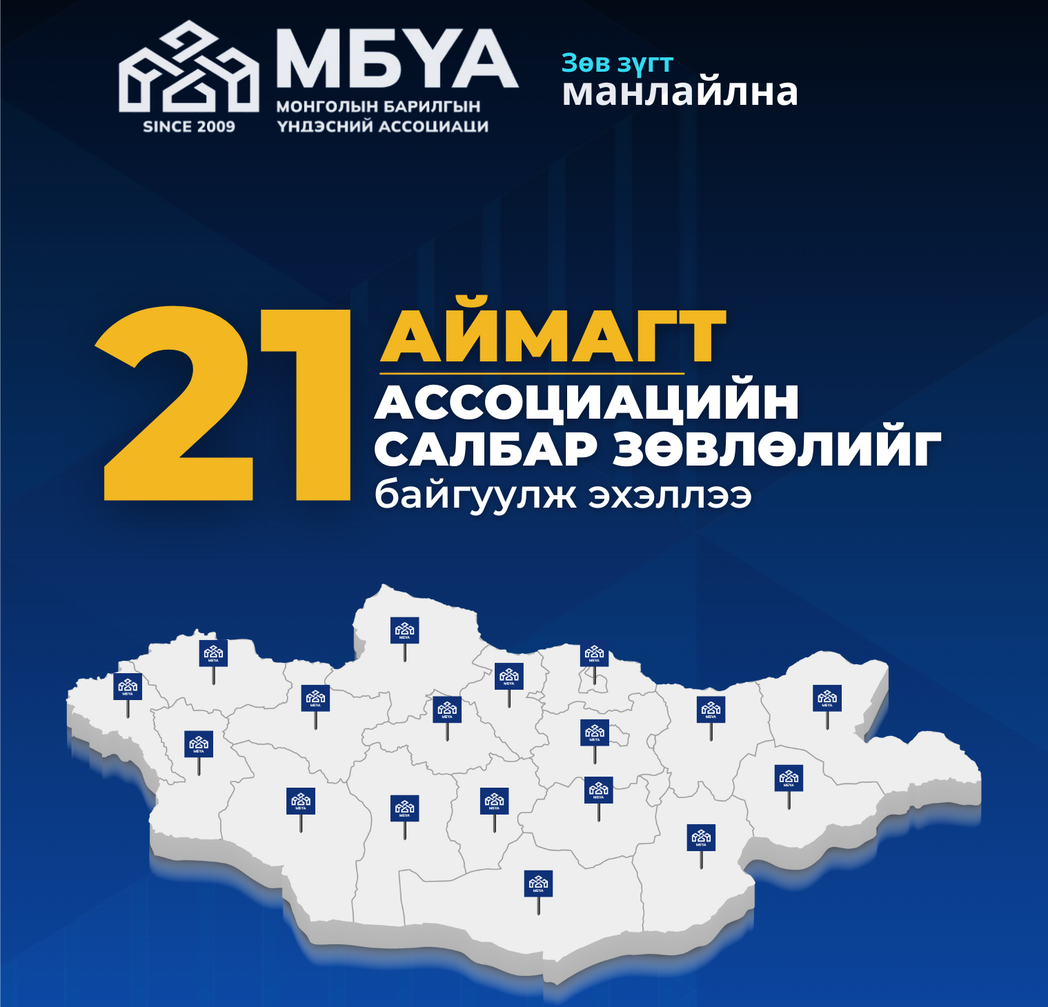 Бид зөвхөн нийслэл хотоор хязгаарлагдахгүй, Монгол Улсын 21 аймагт өөрийн салбар зөвлөлөөрөө дамжуулан үйл ажиллагаагаа явуулж байна. Орон нутгийн барилгын салбарын хөгжлийг дэмжих, бүтээн байгуулагчдыг нэгтгэх, үндэсний хэмжээнд нэгдсэн стандарт, бодлогыг хэрэгжүүлэн ажиллаж байна.