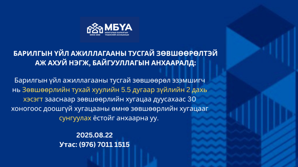 БАРИЛГЫН ҮЙЛ АЖИЛЛАГААНЫ ТУСГАЙ ЗӨВШӨӨРӨЛТЭЙ АЖ АХУЙ НЭГЖ, БАЙГУУЛЛАГЫН АНХААРАЛД: