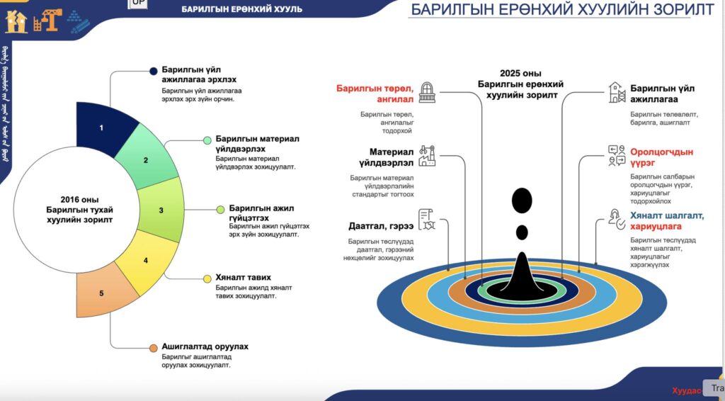 Мөн Барилгын ерөнхий хуулийн үзэл баримтлалын талаарх олон нийтийн хэлэлцүүлгийг ирэх 11-р сард багтаан хийж улмаар 12 сар болон ирэх оны эхний улиралд багтаан багцлан хаврын чуулганаар өргөн барихаар төлөвлөлөө.