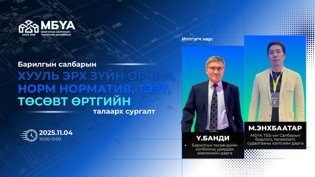 Монголын Барилгын Үндэсний Ассоциаци ТББ-ийн Салбарын бодлого, төлөвлөлт, судалгааны хэлтсийн дарга М.Энхбаатар барилгын үйл ажиллагааны тусгай зөвшөөрлийн шинэ суурь нөхцөл, шаардлага болоод 2025.09.05-ны өдрөөс Зөвшөөрлийн нэгдсэн систем license.mn цахим системээр авдаг болсон тухай болон барилгын зураг төслийн магадлал, салбарын хяналтын тогтолцооны талаар мэдээлэл өглөө.