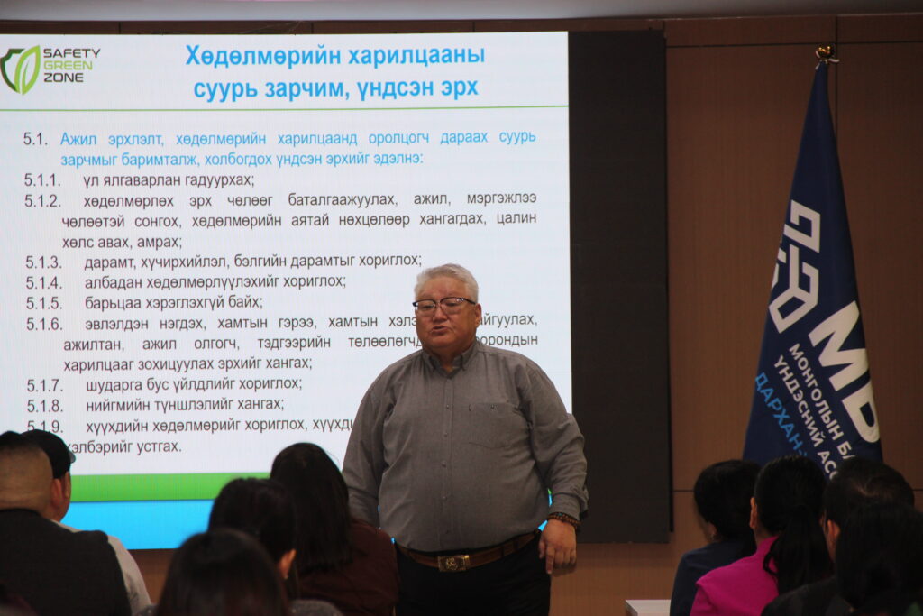 Сургалтын үеэр ХАБЭА-ийн олон улсын жишиг, стратеги төлөвлөлт, анхаарах талаар суралцагчид асууж өөрсдийн ажлын байр дээр гараад байгаа кейс, баримтыг хэрхэн шийдвэрлэх, юуг ажлын талбай дээрх осол гэж үзэх, хууль эрх зүйн хүрээнд ажилчдын аюулгүй байдлыг хэрхэн хангах, ажлын байр дээр осол эндэгдэл гаргахгүй байх тал дээр хэрхэн анхаарах зэргээр харилцан ярилцаж, мэргэжлийн багшаас зөвлөмж, зөвлөгөө авсан ач холбогдолтой сургалт боллоо.