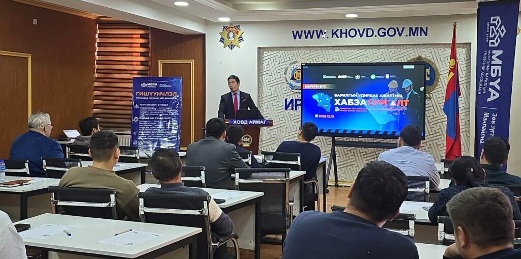 Иймд Монголын Барилгын Үндэсний Ассоциаци ТББ нь Хот байгуулалт, барилга орон сууцжуулалтын яамтай хамтран “БАРИЛГЫН УДИРДАХ АЖИЛТНЫ ХАБЭА”-н зорилтот сургалтыг зохион байгуулж байгаа бөгөөд 2025.12.15-нд Ховд аймгийн Засаг даргын тамгын газар, Газрын харилцаа, барилга хот байгуулалтын газар, Жаргалант сумын Засаг даргын тамгын газар болон Ховд аймгийн МБҮА ТББ-ын салбар зөвлөлтэй хамтран баруун бүсийн барилгын салбарын удирдах ажилтнуудад зориулан БАРИЛГЫН УДИРДАХ АЖИЛТНЫ ХАБЭА-ын сургалт ба “БАРИЛГЫН ҮЙЛ АЖИЛЛАГАА ТУСГАЙ ЗӨВШӨӨРЛИЙН ХҮСЭЛТ ГАРГАХ ЗААВАР ЗӨВЛӨГӨӨ”-сургалтыг зохион байгууллаа.